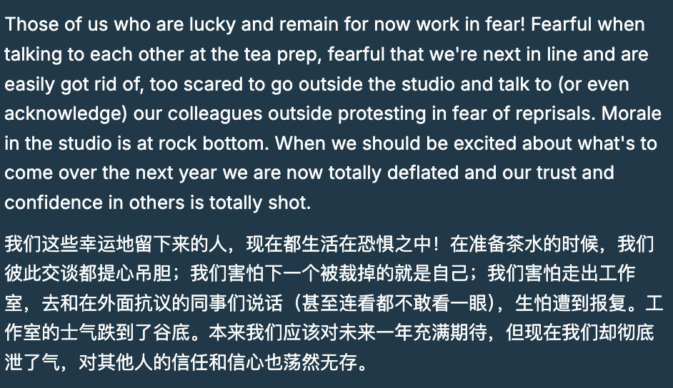 一个英国员工就说,虽然他没被裁,但留下来的这些人每天都在恐惧中工作。大家在茶水间互相谈话都提心吊胆,走出公司也不敢看那些抗议的同事,怕遭到报复,怕自己是下一个被裁掉的。