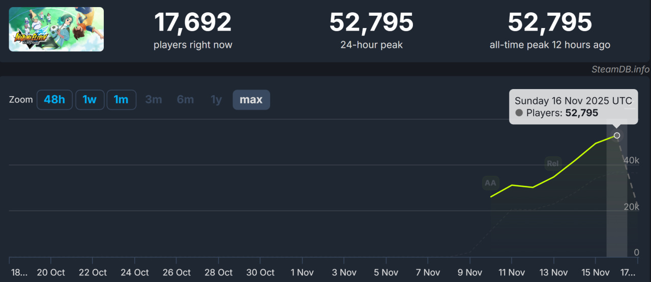 不过相对来说,单机市场水花就没那么大了,因此L5在年初一款小爆款《幻想生活i》(最高近7W在线)之后,让玩家等待多年的《闪电十一人》系列新作《闪电十一人 英雄们的胜利之路》(以下简称《闪电十一人》)首日即砍下3W在线、之后更是连续逆跌,如今已经迈过5W大关。