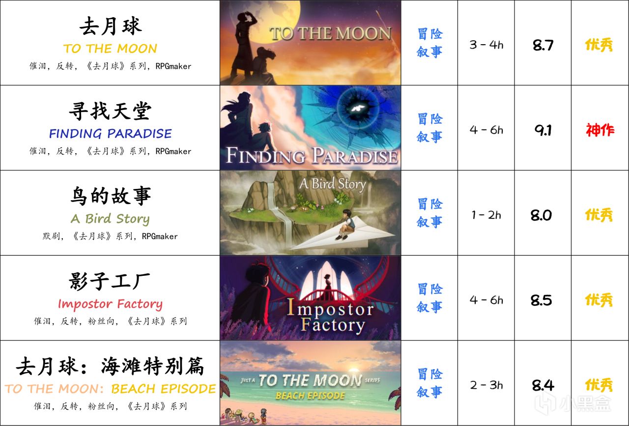推荐顺序:《去月球》 - 《寻找天堂》 - 《鸟的故事》(外传性质,建议放在《寻找天堂》之后)- 《影子工厂》 - 《去月球:海滩特别篇》 - 《去月球 Last Hour RPG》(未发售)
