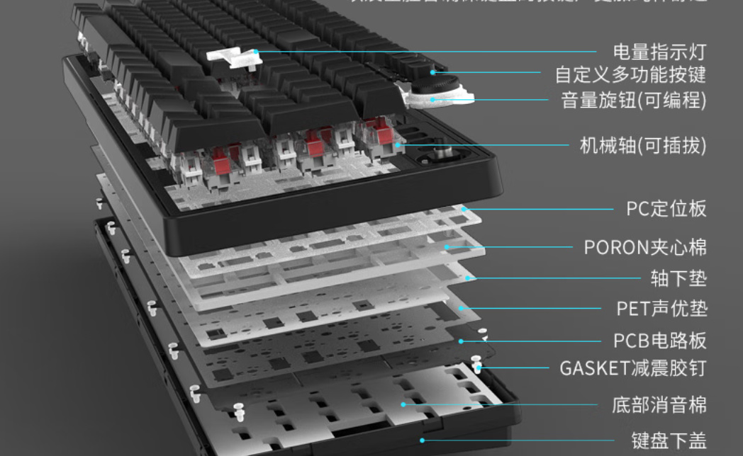 当然,除了抖机灵外,这把键盘的确有可取之处,入门版本在200元以内的价格,给到了五层填充Gasket结构,0.0mm的RT精度也绝对够用,生态位独特。