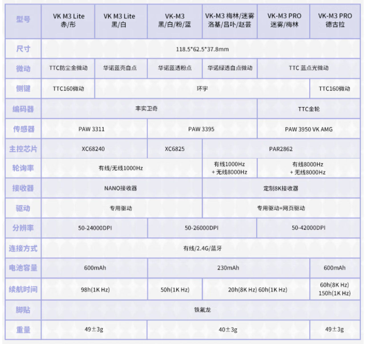 这几个版本都给到PAW3395,目前已经卷到百元价位的传感器,但是VK给到一个比较好的主键微动,华诺蓝透粉点,而特殊配色版本是绿透白点。