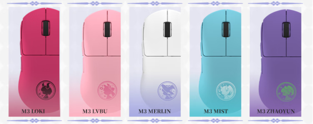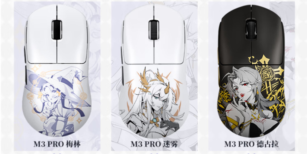 最后则是299元的M3 Pro版本,3950 VK定制传感器(42000DPI),壳体UV打印做的很到位,细节丰富但不艳丽,有种泡沫经济时代日漫的味道。