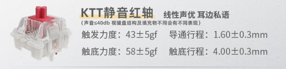 个人最喜欢的轴体还是KTT静音红轴,手感比较绵软,回弹很轻柔,虽然不是特别合适打游戏,但是码字是相当舒服,也不吵人,有的时候晚上赶稿就用它。