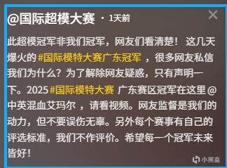 有消息说真正的冠军该是叫艾玛尔的选手。这说法很快得到了第 13 届国际超模大赛官方的确认,他们直接澄清,视频里的赛事跟自己没关系,自家广东赛区的冠军确实是艾玛尔,对方还发过带颁奖背景幕的视频佐证。