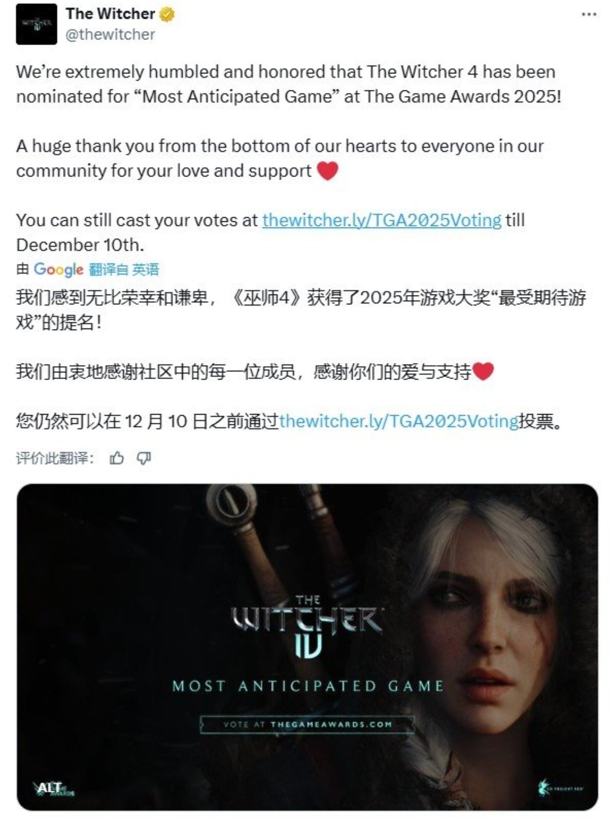 TGA 2025提名名單正式公佈,CD Projekt Red新作《巫師4》入圍“最受期待遊戲”獎項,將與《GTA6》、《007:初露鋒芒》、《漫華金剛狼》及《生化危機:安魂曲》共同角逐這一榮譽。