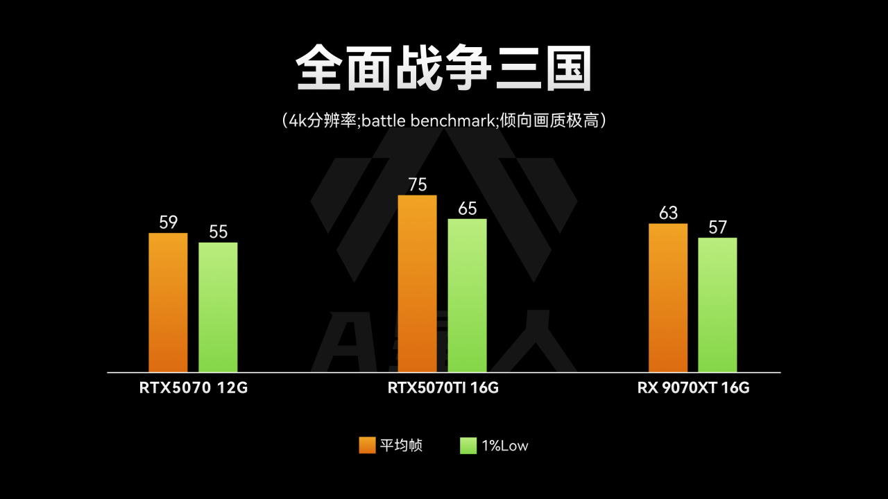 全面战争三国中,不管是2K还是4K分辨率5070TI的表现都是最好的,其中4K分辨率下5070Ti是,唯一能够保持60以上Low帧的显卡,5070在4K分辨率的平均帧跟“流畅运行”也只差一帧。