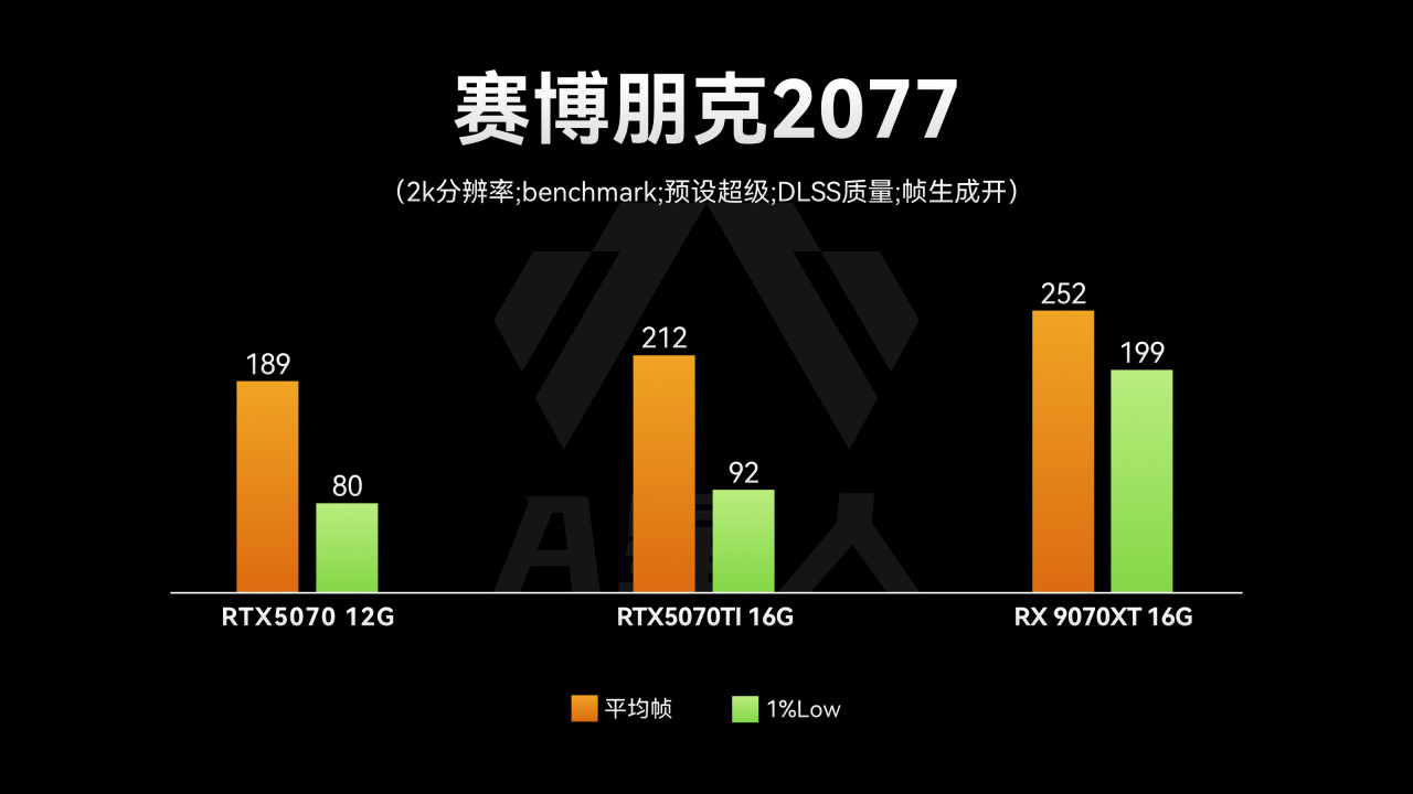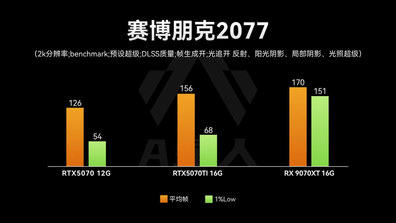 赛博朋克2077就到了A卡的主场,2K分辨率9070XT平均帧领先5070TI 40帧,领先5070超过60帧,1%Low帧甚至超过5070TI一百多帧,这就是FSR 4.0的威力吗?