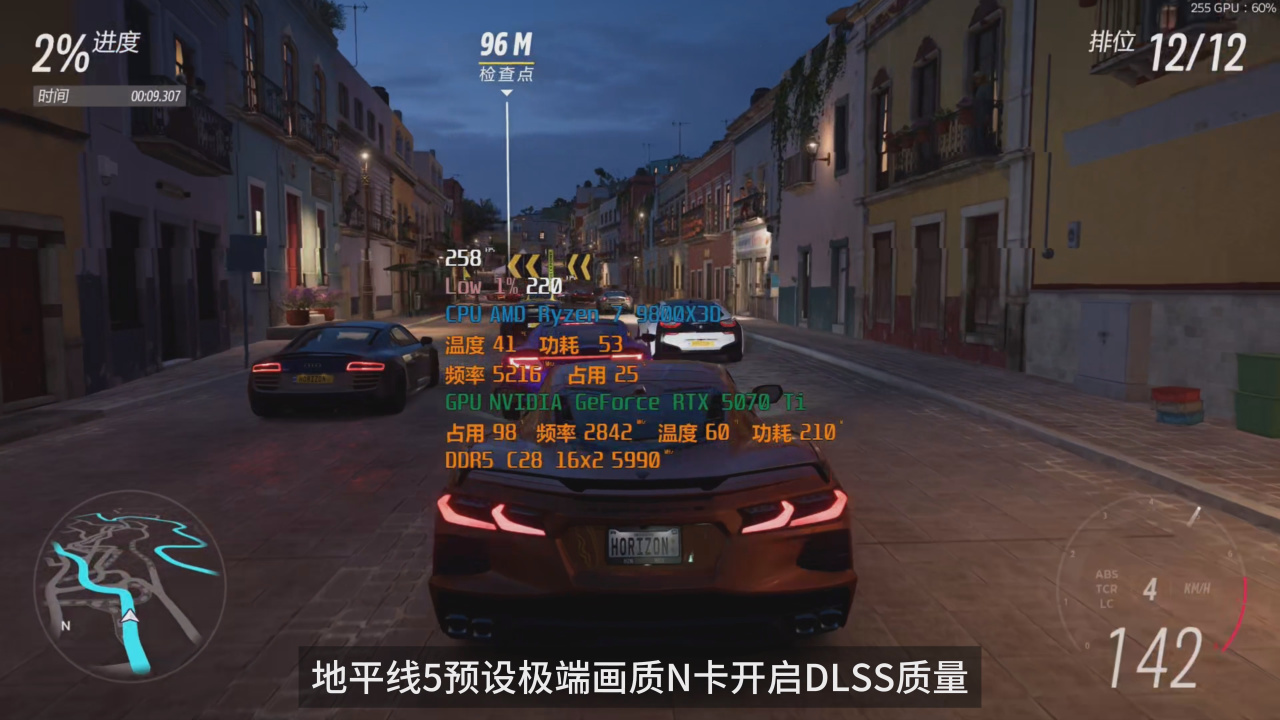 地平线5预设极端画质N卡开启DLSS质量,A卡开启FSR2.2质量,9070XT在2K画质下没有打过5070。