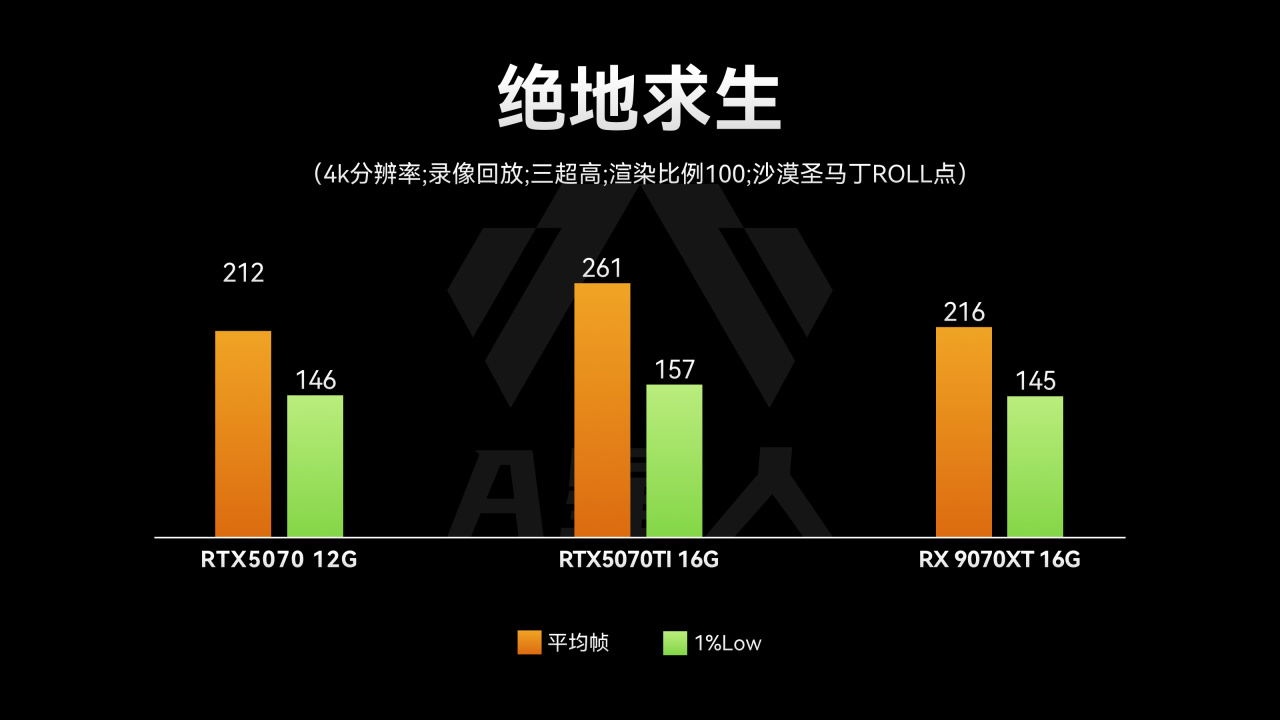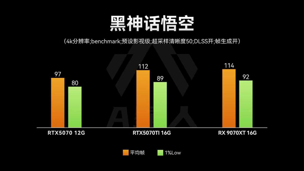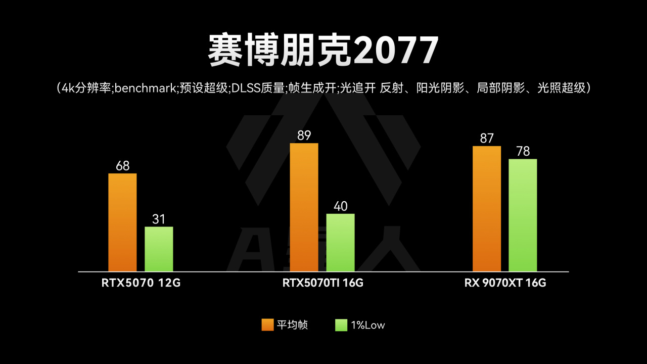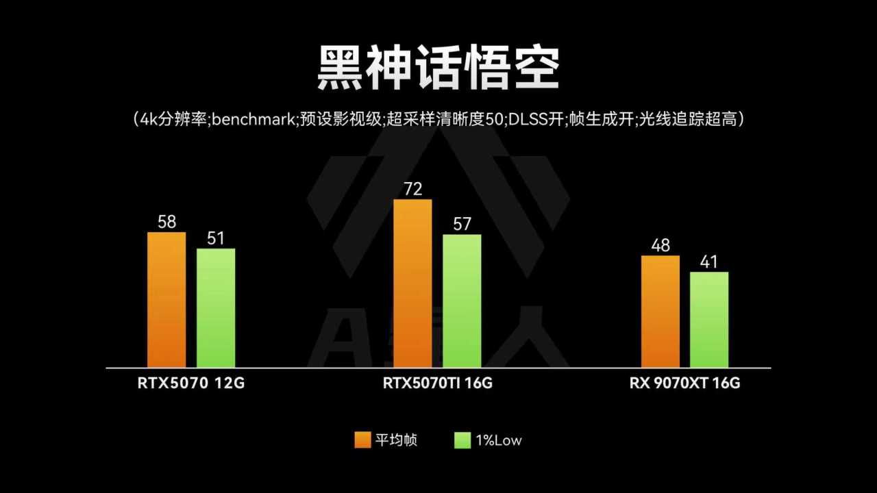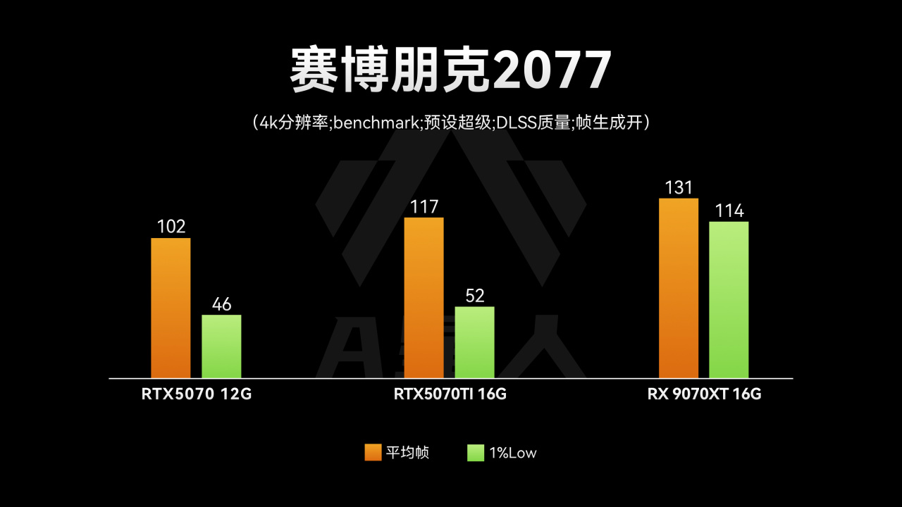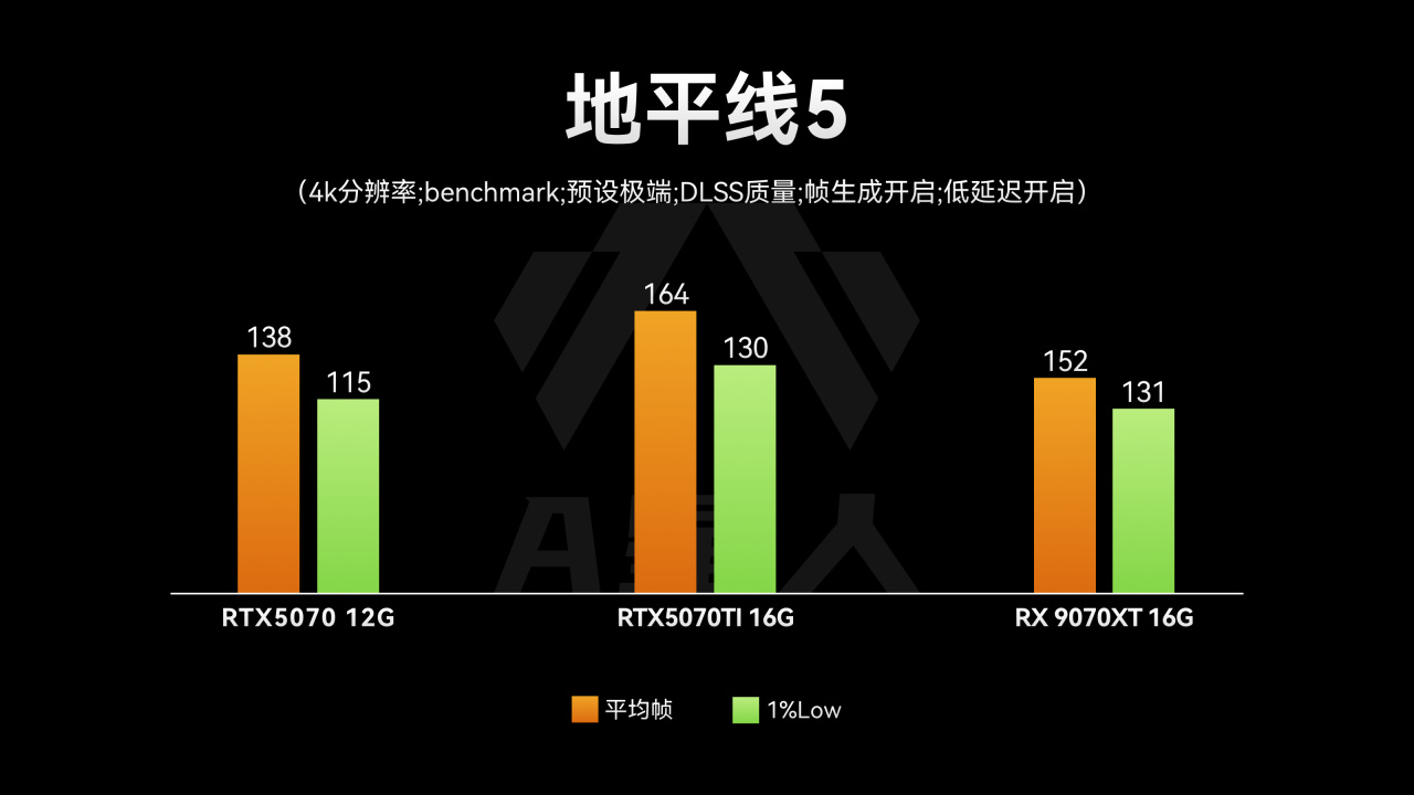 到了4K分辨率下9070XT继续稳定发挥,平均帧和Low帧都比较高,此时5070和5070Ti的Low想稳住60都非常困难。