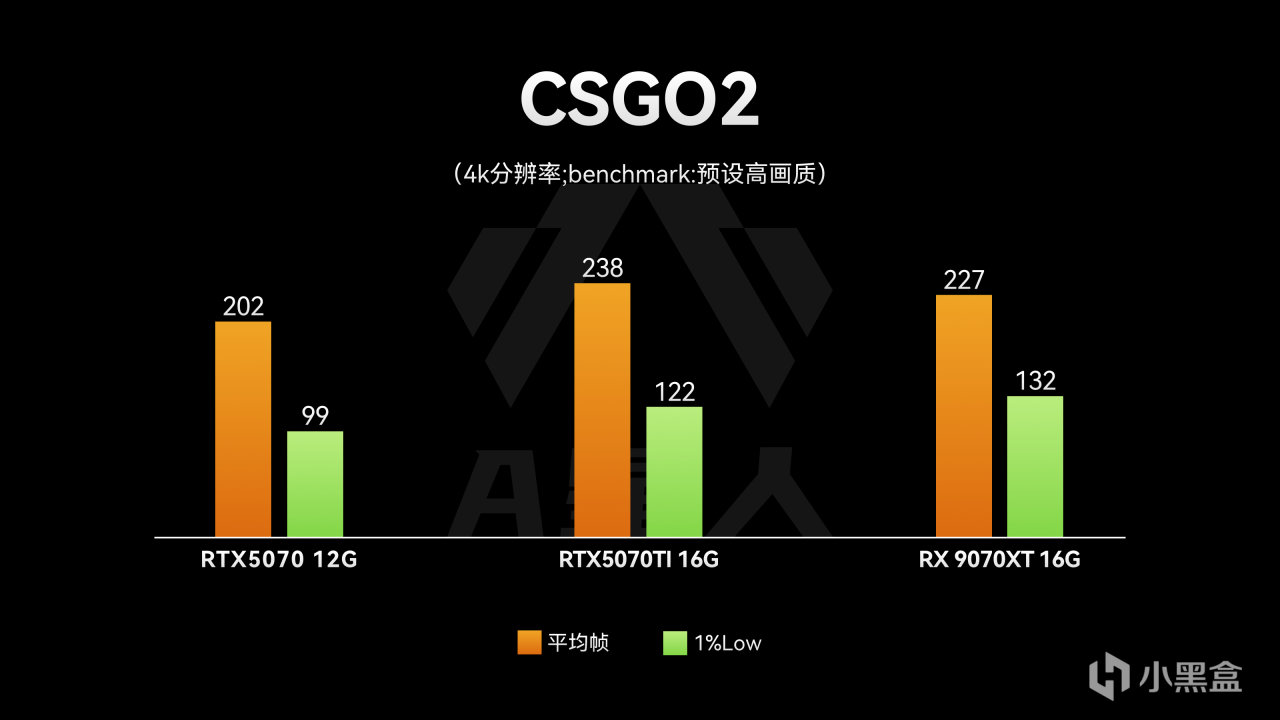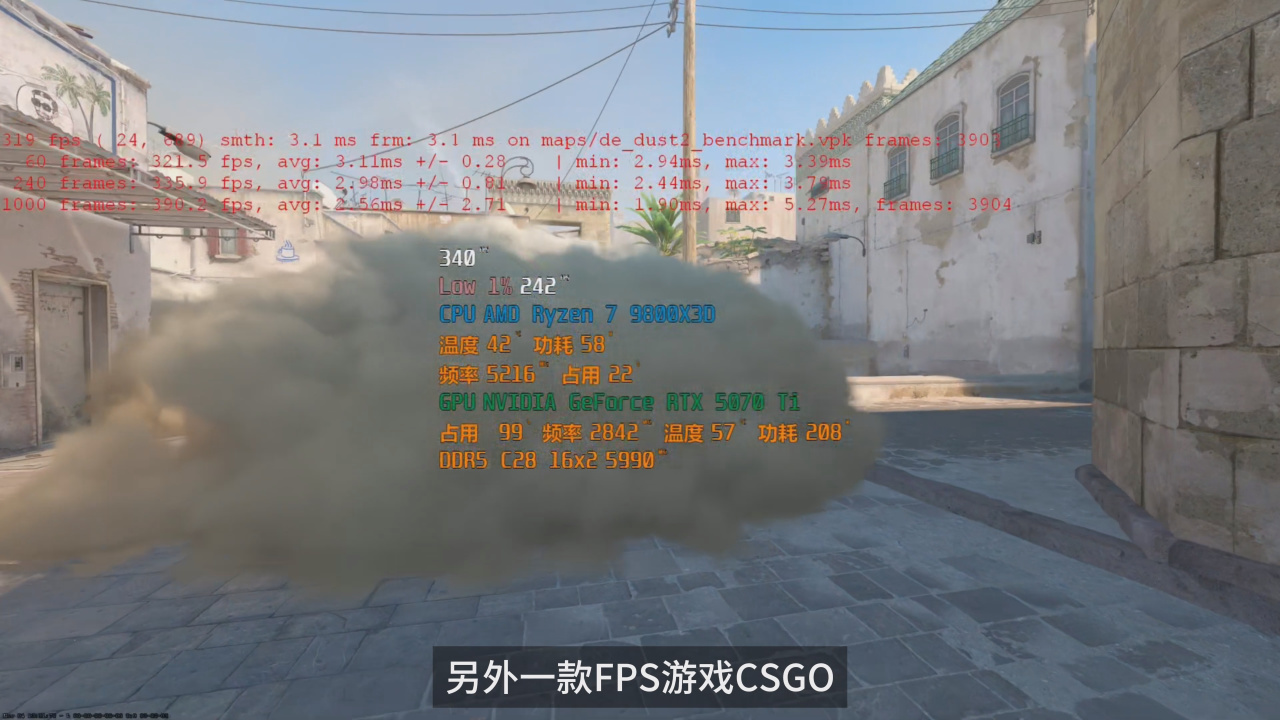 另外一款FPS游戏CSGO,2K高画质下,9070XT的表现最好,平均帧和Low帧都超过了5070Ti,5070的Low帧还是比较低只有169。