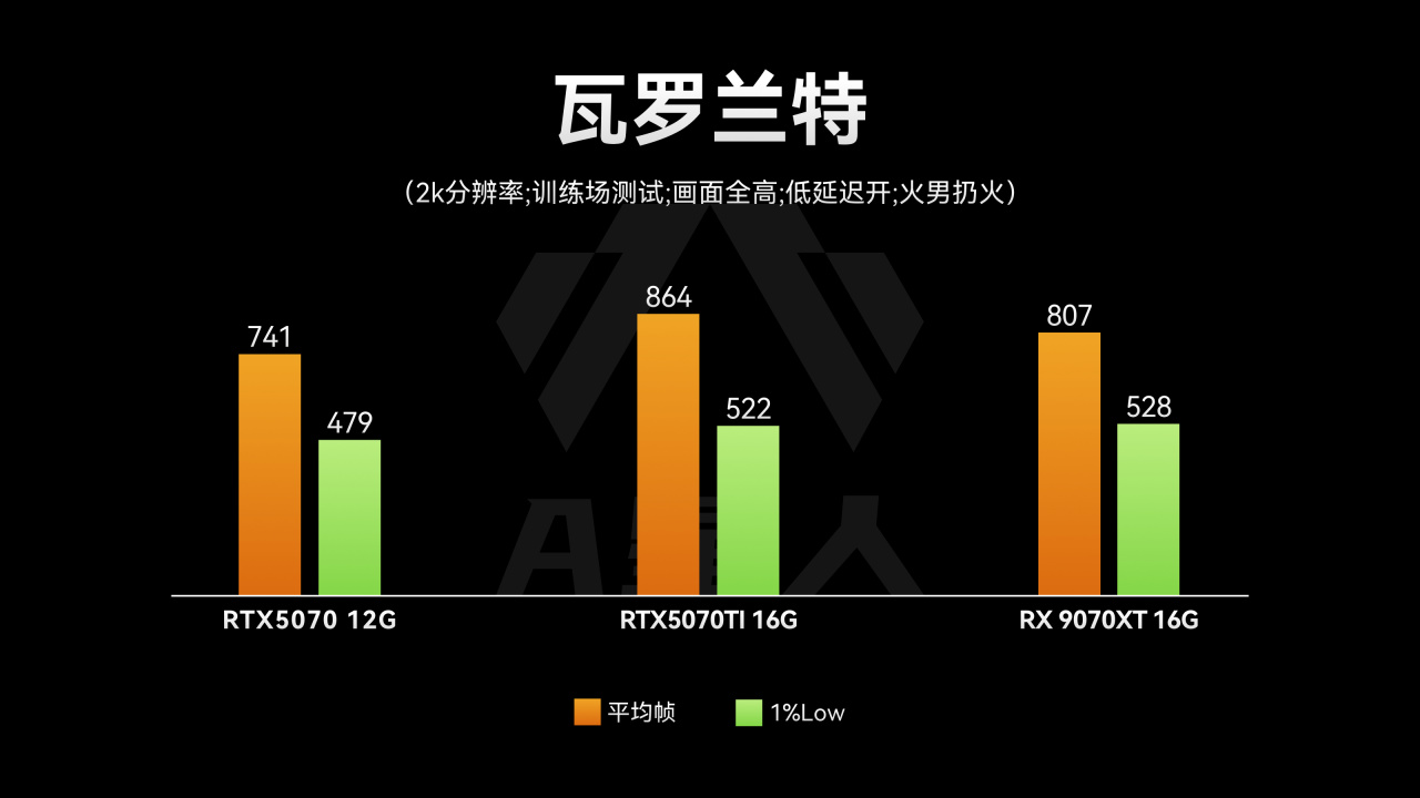 瓦洛兰特中,2K分辨率下5070Ti和9070XT平均帧超过800,5070稍低一点。