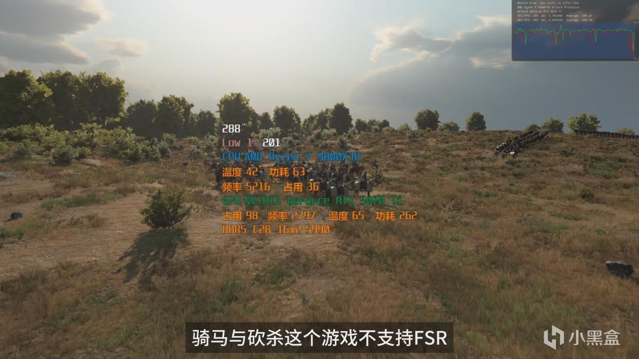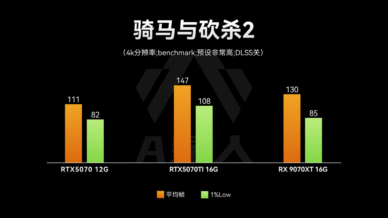 骑马与砍杀这个游戏不支持FSR,但是9070XT的表现依然是强过5070,平均帧和Low帧表现最好的还是5070Ti。