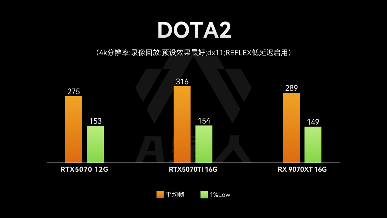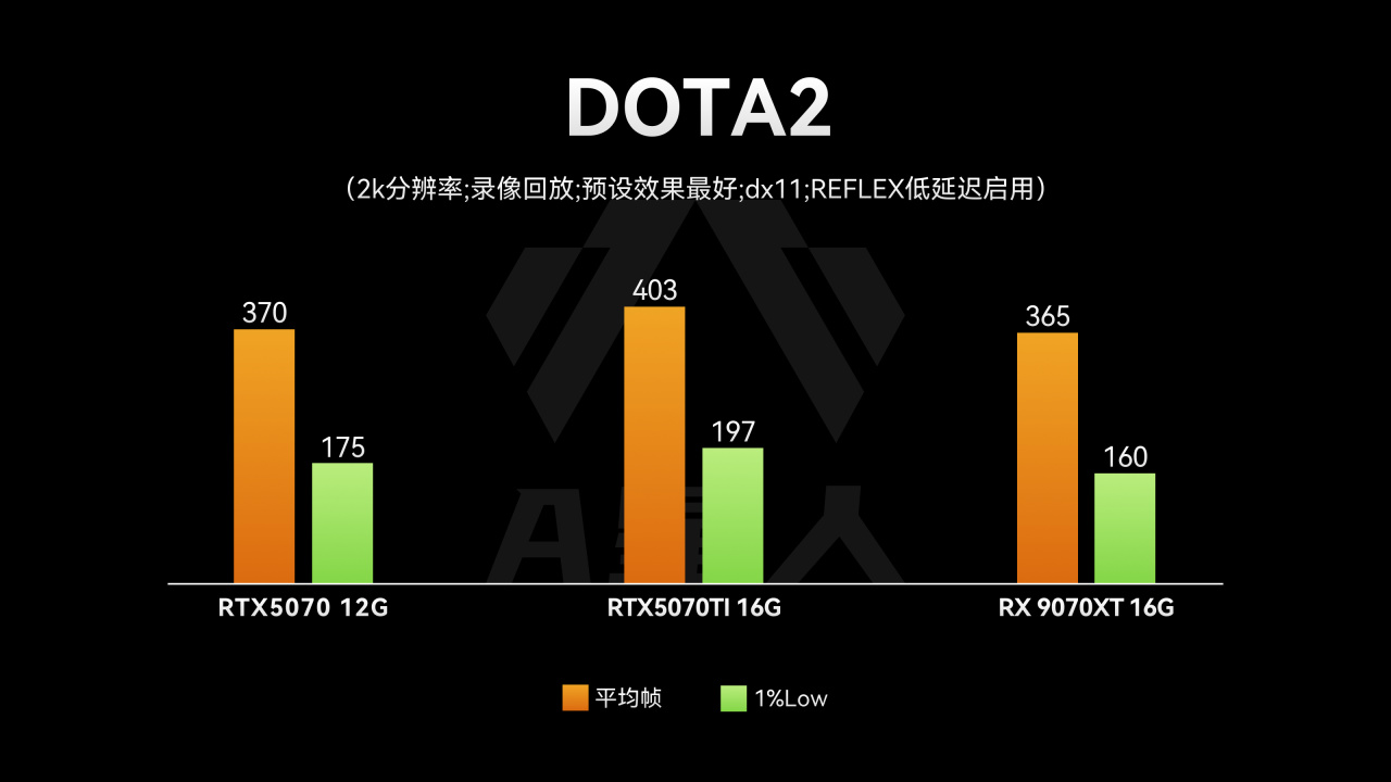 最后一款网游,Dota2 2K分辨率预设效果最好画质,两张N卡的表现都比9070XT强,5070也小幅度领先9070XT。