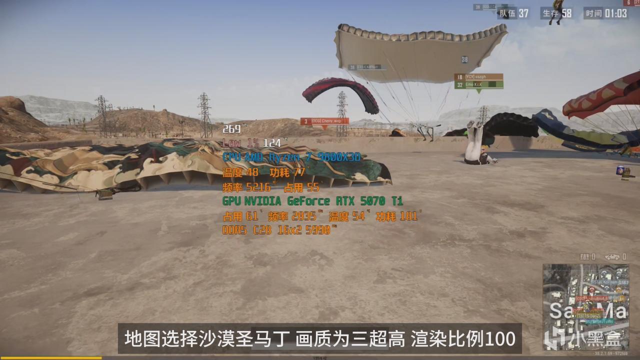 先看绝地求生,地图选择沙漠圣马丁,画质为三超高 渲染比例100,2K分辨下 5070和5070Ti差距不大,两者平均帧都在320以上,1%Low帧也比较接近都超过了160,而9070XT这边就相对低一点。