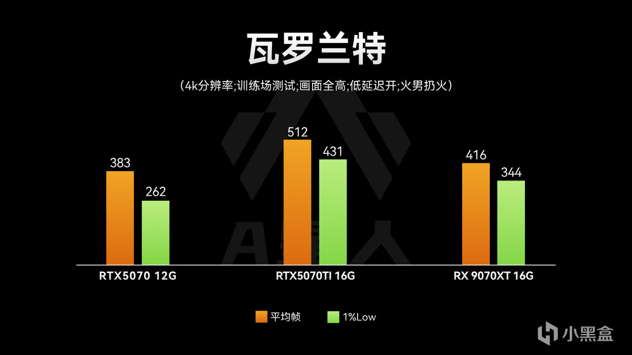 到了4K分辨两中,差距明显拉开,其中9070XT平均帧和Low帧落后5070Ti 100帧左右,这里5070的帧率最低,5070Ti的Low帧都比5070的平均帧高了50左右,尽管瓦洛兰特不怎么吃配置但到了高分辨率还得是需要大显存。