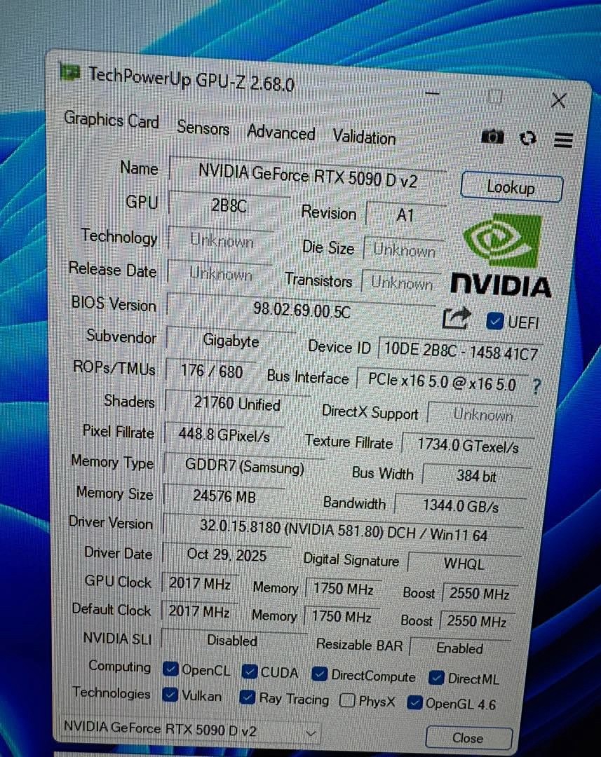 5090D V2 GPU-Z ROPs数量均正常,显存是三星颗粒。