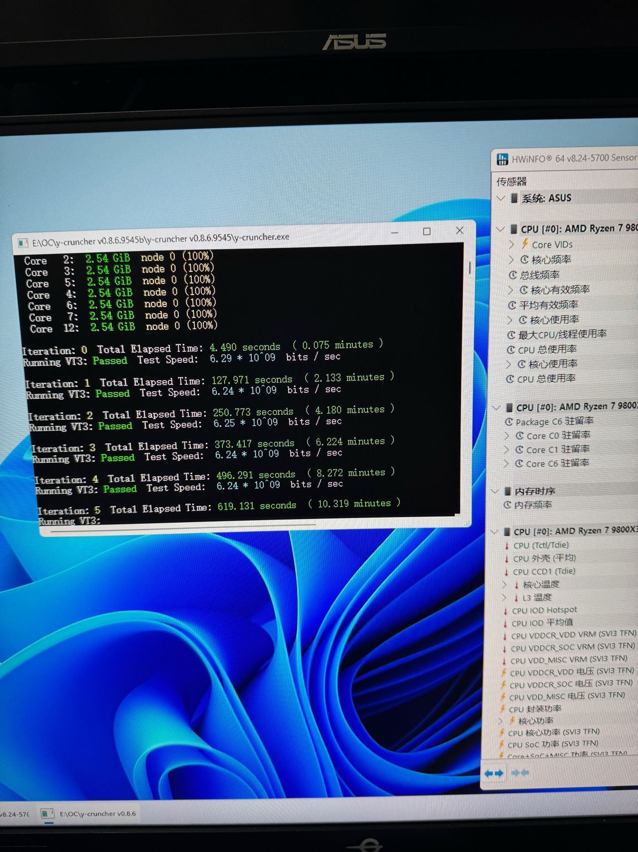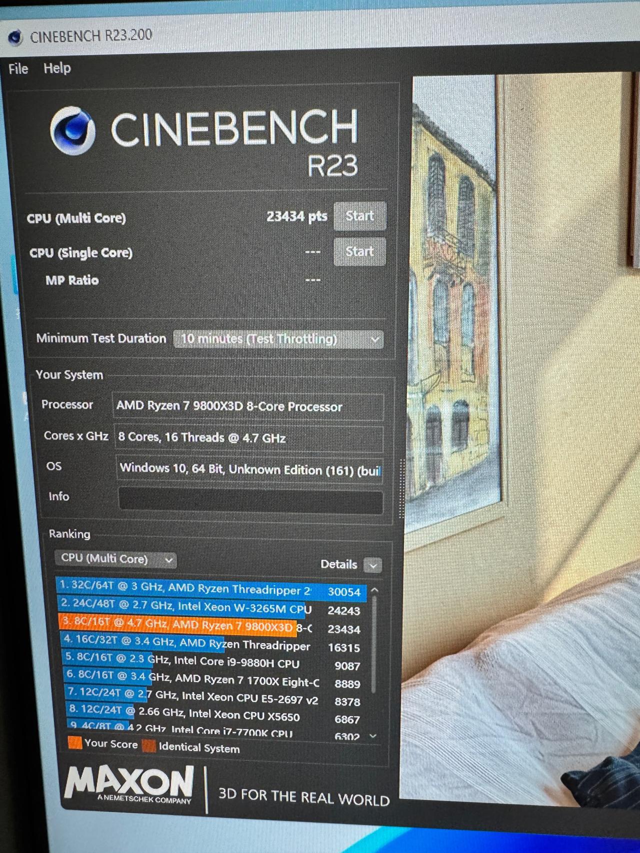 R23 多核 10分钟,23434分,对于PBO来说这分数正常范围内,温度表现和电压也正常范围内。
