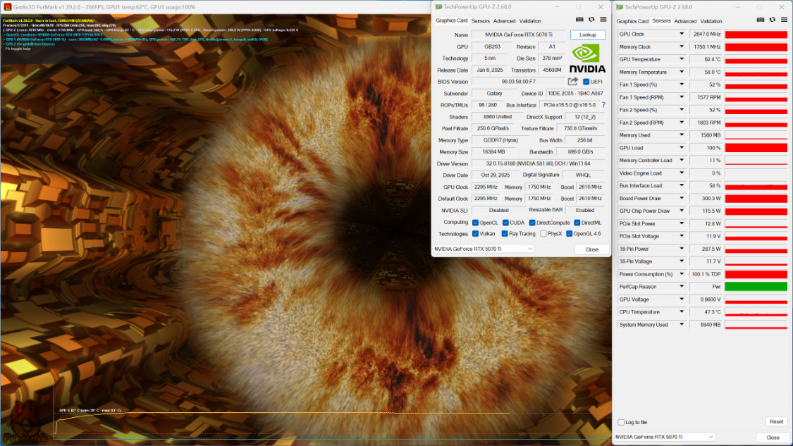 FurMark烤机测试,显卡温度63°左右,显卡功耗为300W左右;