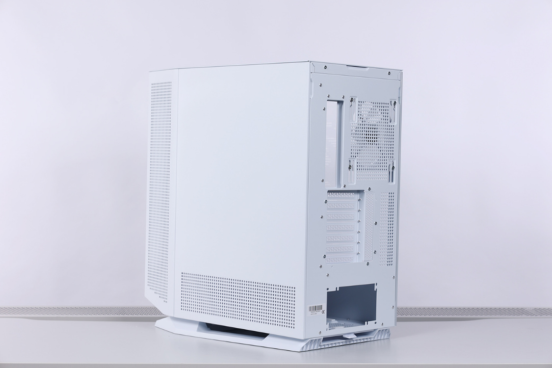 机箱右侧采用两块金属面板结构,并均有大面积散热网孔设计(内置磁吸防尘网),靠前面这块金属侧板也带一定弧度。