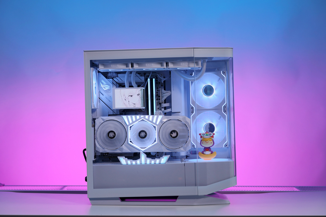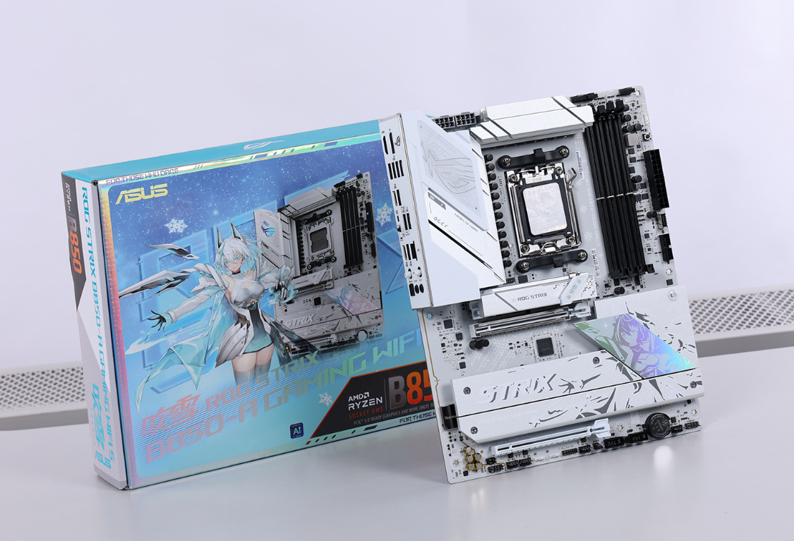 智商税拉满的全白主题装机,主板选配的是华硕ROG B850-A Gaming WIFI S吹雪主板。全白pcb搭配大面积白色散热装甲,颜值在线。配置方面14+2+2相智能供电设计,也能轻松拉满98X3D性能。