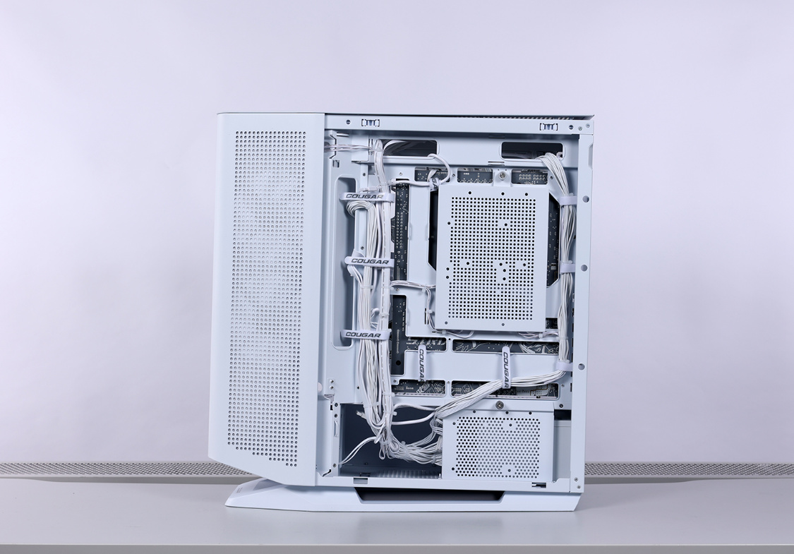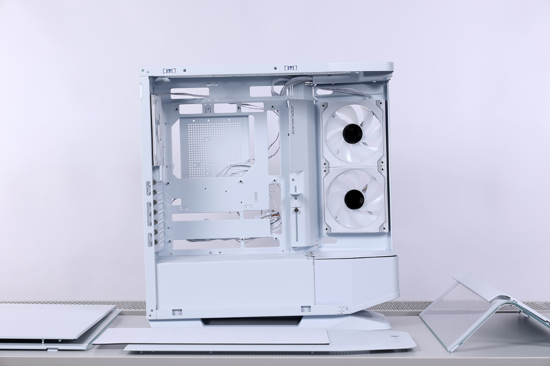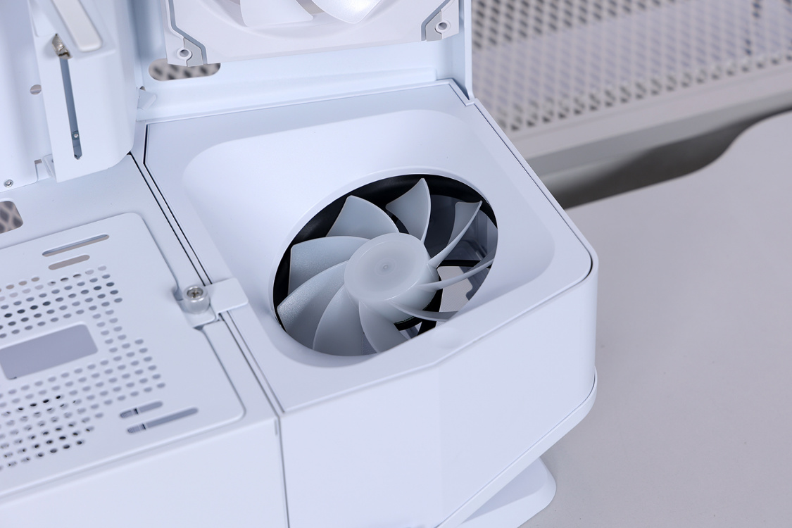 兼容性方面,机箱最大支持E-ATX主板,并支持ATX规格的BTF背插式主板。显卡安装限长420mm,PCIE插槽模块支持整体切换至竖装模式。散热方面,风冷安装限高180mm,支持顶置360侧置280水冷,最大可安装9把120mm规格散热风扇。机箱顶部与电源仓上方风扇支架均采用可拆模块化设计,可以有效降低装机难度。机箱侧板、尾部预装了140mm规格的骨伽星链积木风扇(1正+2反),电源仓前部的DLC仓室中还预装了带1把骨伽DF120反叶版风扇的散热模块。此外,还能自选旋转台DLC模块,将机箱打造成与众不同的硬件展示柜。