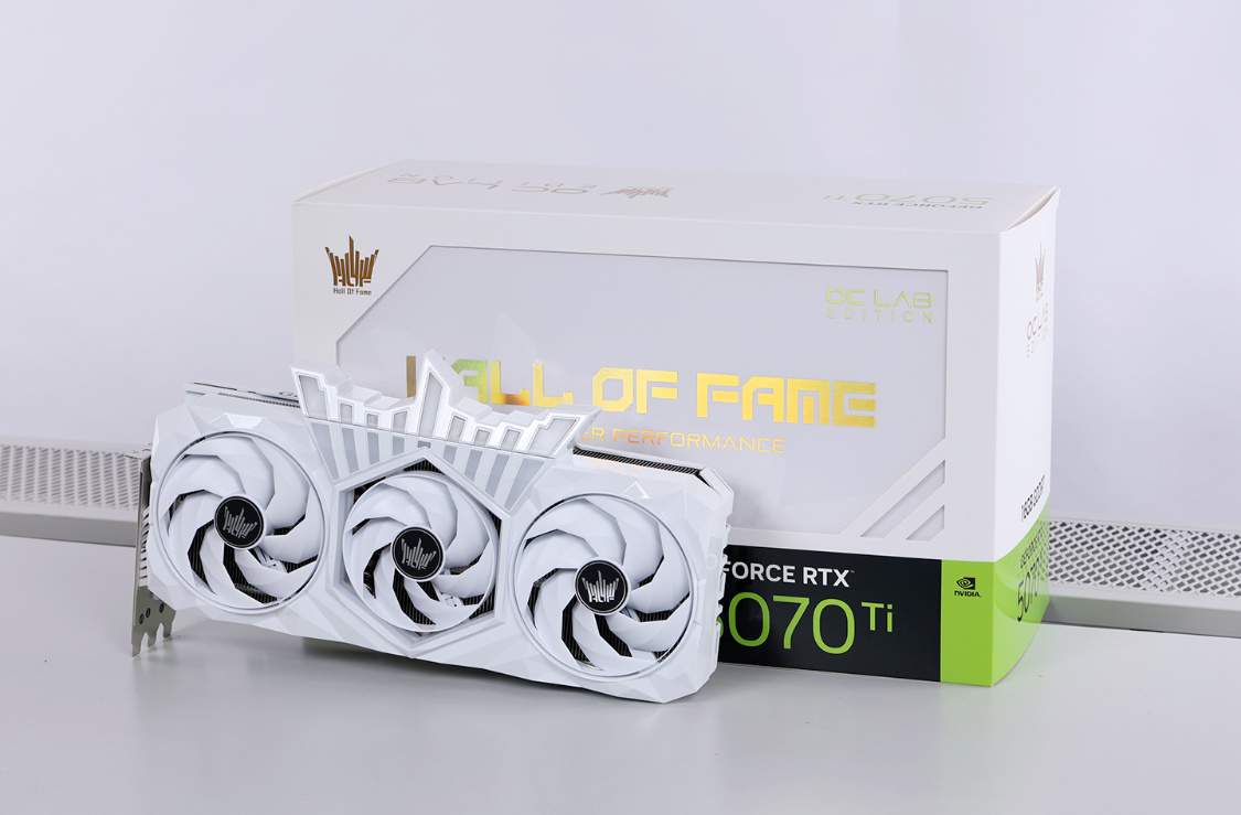 都承认自己是大冤种了,那显卡选配顶流非公影驰RTX 5070 Ti HOF OC LAB Deluxe-X显卡,也没啥毛病吧。全白配色的显卡本体,钻石切割造型散热外壳,质感优秀。3颗白色无光霜环风扇(左右102mm+中间92mm)设计,同时中间风扇边缘及顶部灯带,搭配同样搭载ARGB灯效的皇冠设计,信仰拉满。(遗憾的是皇冠,跟我曲面屏水冷有点小冲突)