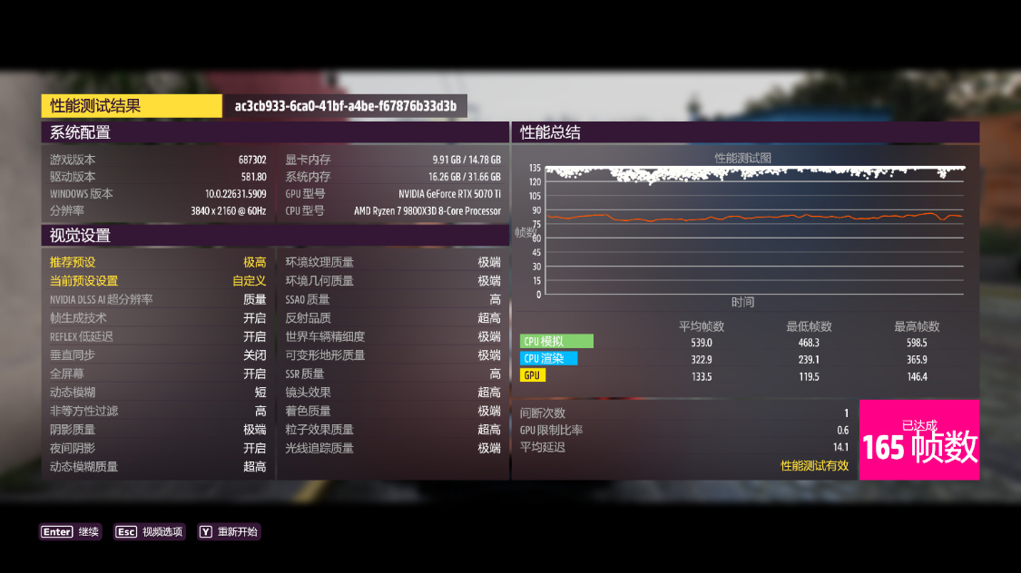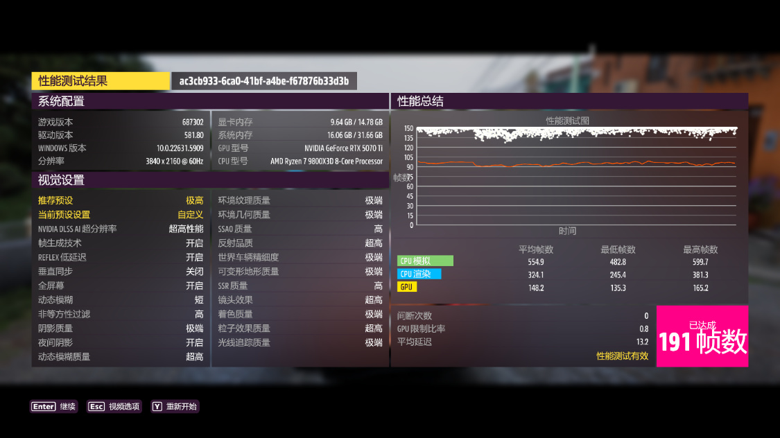 《极限竞速·地平线5》测试,4K分辨率下,极端画质,极端光追,开启DLSS 3.0并设为超高性能模式,游戏平均帧数191 FPS,DLSS为质量模式时,游戏平均帧数165 FPS;