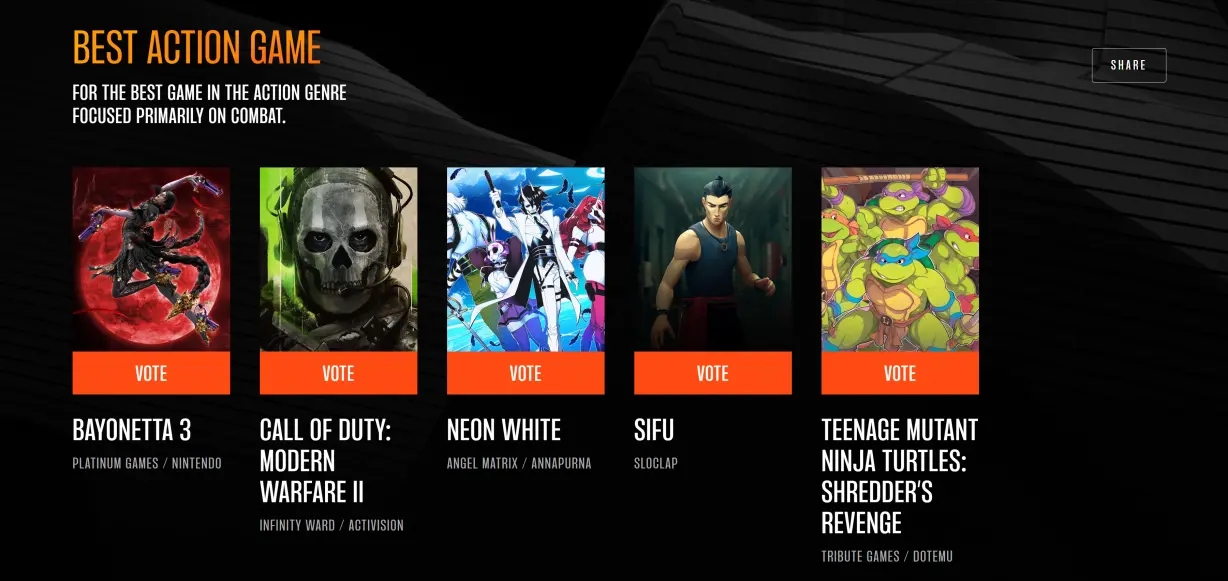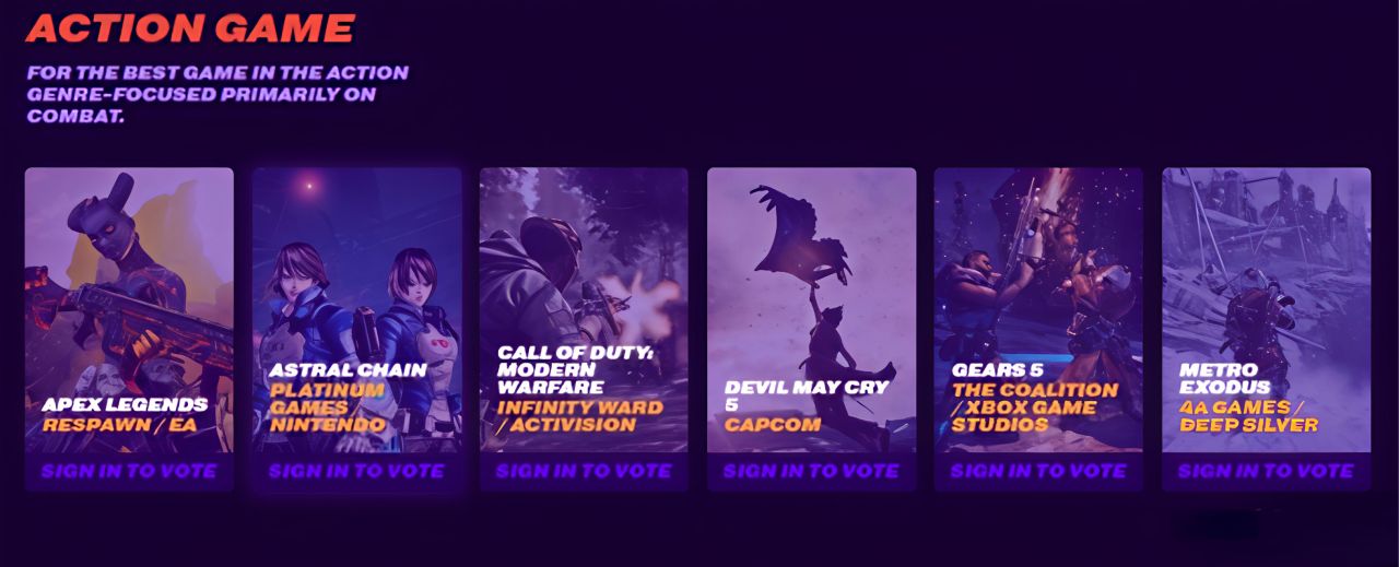 該獎項2016年TGA第三屆起設立,官方定義爲聚焦戰鬥的頂尖動作類遊戲。其涵蓋範圍較廣,像格鬥、平臺跳躍、FPS等側重戰鬥的類型皆可入選,評判核心是戰鬥機制、操作爽感與節奏,比如《黑神話:悟空》的棍法法術戰鬥、《鬼泣5》的華麗連招都契合該獎項特質。
