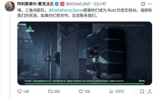 《Rust》开发商 Facepunch Studios 的运营长兼总监 Alistair McFarlane 在预告片发布后不久便在推特上点名指出这一问题。