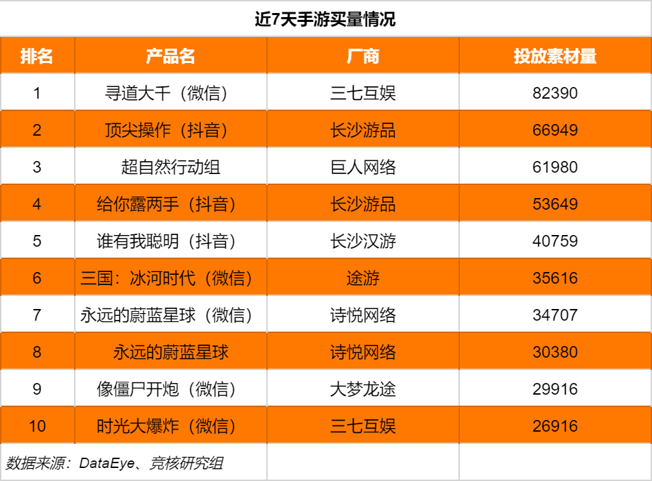 根据DataEye数据显示,近7天国内游戏买量市场依旧以小游戏厂商为主导,包括三七互娱、、大梦龙途、途游、诗悦网络、长沙游品等。此外,巨人网络今年的爆款新作《超自然行动组》也在近期加大了买量投入。