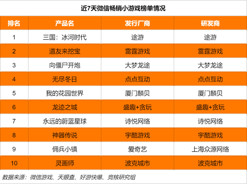 根据微信近七天畅销小游戏榜单显示,途游《三国:冰河时代》表现强劲,长期处在榜单首位。整体来看,前十小游戏基本是老熟人,包括雷霆游戏《道友来挖宝》、大梦龙途《向僵尸开炮》、点点互动《无尽冬日》等。