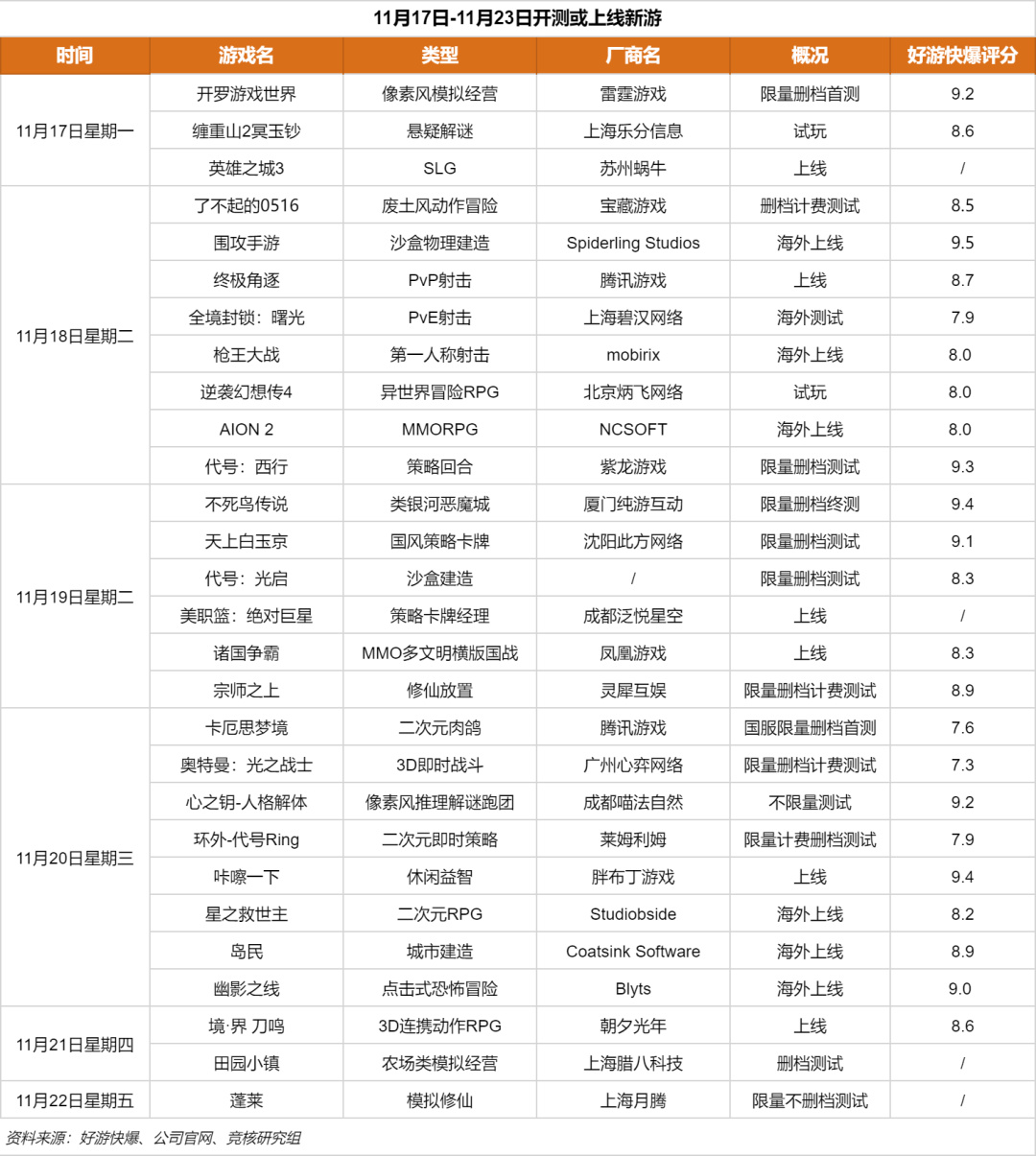 下周(11月17日-11月23日)开测或上线的重点新游包括腾讯游戏《终极角逐》《卡厄思梦境》、上海碧汉网络《全境封锁:曙光》、朝夕光年《境·界 刀鸣》等。