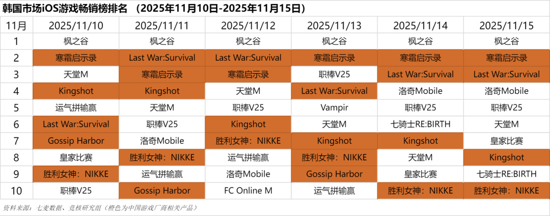 韩国市场2025年11月10日-2025年11月15日iOS游戏类畅销榜中,点点互动《寒霜启示录》和Funfly(新加坡)《Last War: Survival Game》进入前三。