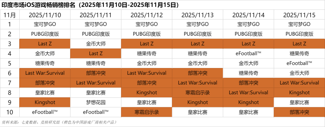 印度市场2025年11月10日-2025年11月15日iOS游戏类畅销榜中,Florere Game旗下的《Last Z: Survival Shooter》表现亮眼,本周一直保持在Top5内。此外,Supercell《部落冲突》、点点互动《寒霜启示录》《Kingshot》等也进入了游戏畅销榜前十。