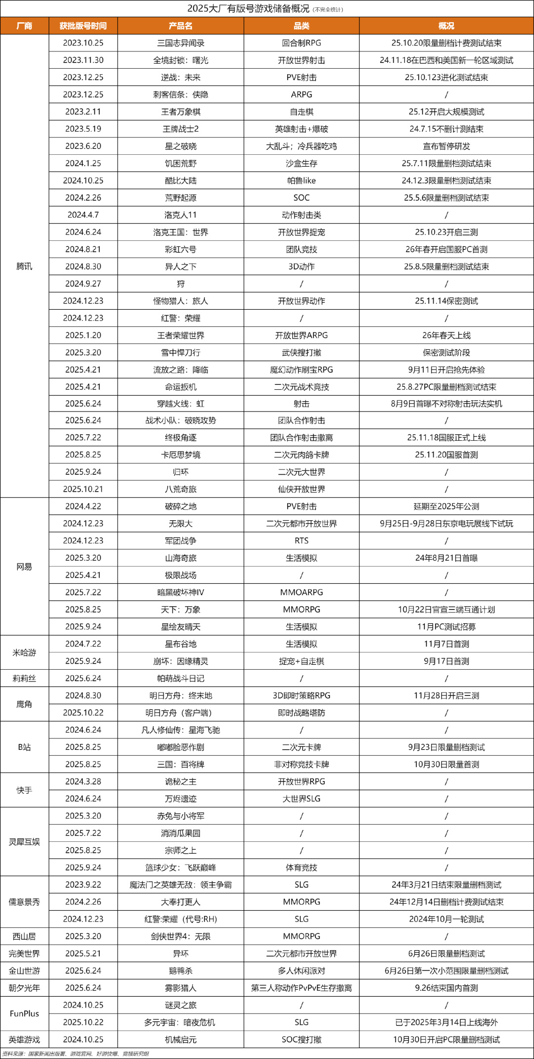 据竞核不完全统计,2025年大厂有版号游戏储备概况如上图,腾讯大约有27款,包括《王者荣耀世界》《异人之下》《命运扳机》《穿越火线:虹》等。
