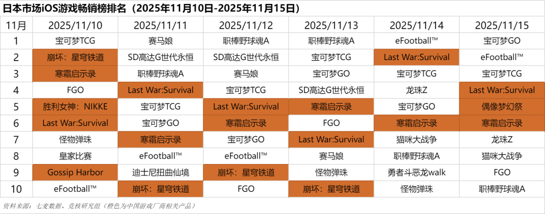 日本市场2025年11月10日-2025年11月15日iOS游戏类畅销榜中,进入前十的中国厂商游戏有米哈游《崩坏:星穹铁道》、腾讯游戏《胜利女神:NIKKE》、柠檬微趣《Gossip Harbor》、乐元素《偶像梦幻祭》、点点互动《寒霜启示录》等。