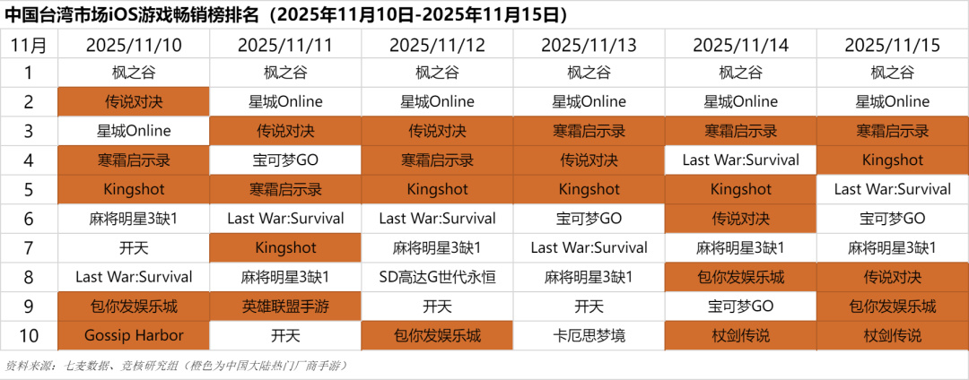 中国台湾市场2025年11月10日-2025年11月15日iOS游戏类畅销榜中,柠檬微趣《Gossip Harbor》、点点互动《寒霜启示录》《Kingshot》,以及Funfly(新加坡)《Last War: Survival Game》等位列前十。