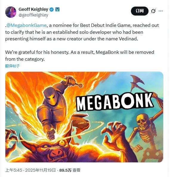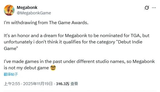 1. 近日,TGA2025公布了今年全部的提名名单,其中在最佳首发独立游戏中有一款roguelike生存游戏《Megabonk》入选提名。而今日,《Megabonk》的开发者在社交媒体留言,表示将退出TGA2025的评选,开发者称:“《Megabonk》能够获得TGA提名是我的荣幸和梦想,但遗憾的是,我认为它不符合“最佳首发独立游戏”这一类别的资格。因为我过去曾以不同的工作室名称制作过游戏。所以《Megabonk》并非我的首秀作。”来源:机核网