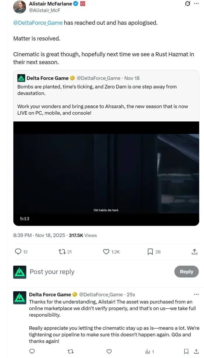 1. Facepunch 工作室高管、《Rust》执行制作人 Alistair McFarlane 在社交媒体表示,《三角洲行动》未经许可使用了工作室首席武器及道具艺术设计师 Thomas Butters 多年前打造的 C4 素材。在数小时后,Alistair McFarlane 表示《三角洲行动》开发团队已经联系并对此进行道歉,双方达成了和解。他还表示希望游戏的下个赛季看到《Rust》主题的防护服。 《三角洲行动》官方回应称:“感谢你的理解,Alistair!这个素材是我们从一个素材网站购买的。没有进行妥善的验证是我们的失误——我们对此负全部责任。来源:机核网