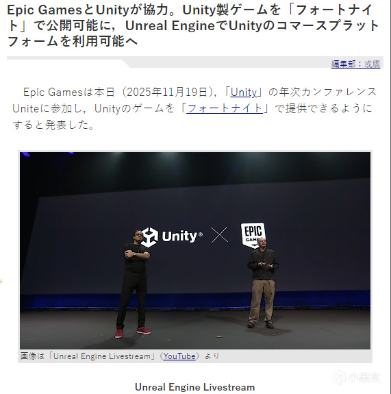 1. Epic Games 与 Unity 合作,使 Unity 游戏能够发布到《堡垒之夜》中,并可将 Unity 的商业平台与虚幻引擎结合使用。来源:4gamer