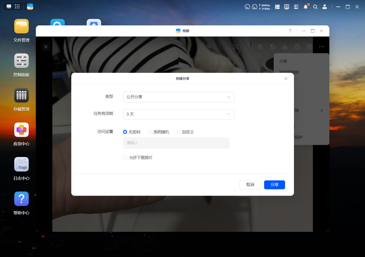 相册内照片分享可以直达手机上几乎所有的APP,也可以和百度网盘一样以链接形式分享给朋友,设置有效期、密码等访问权限。