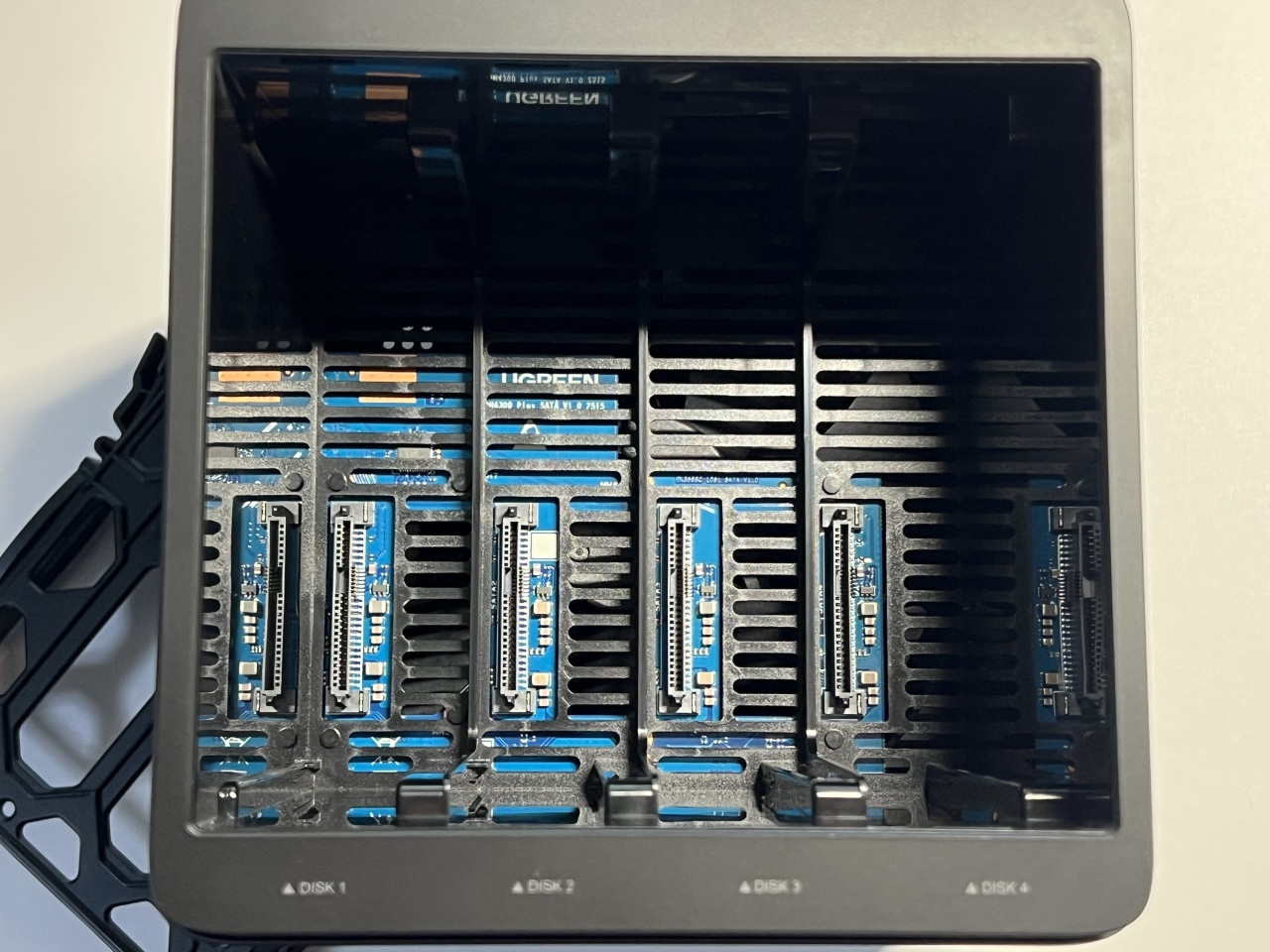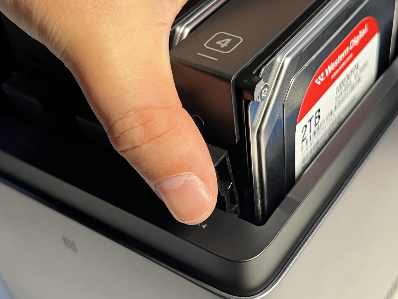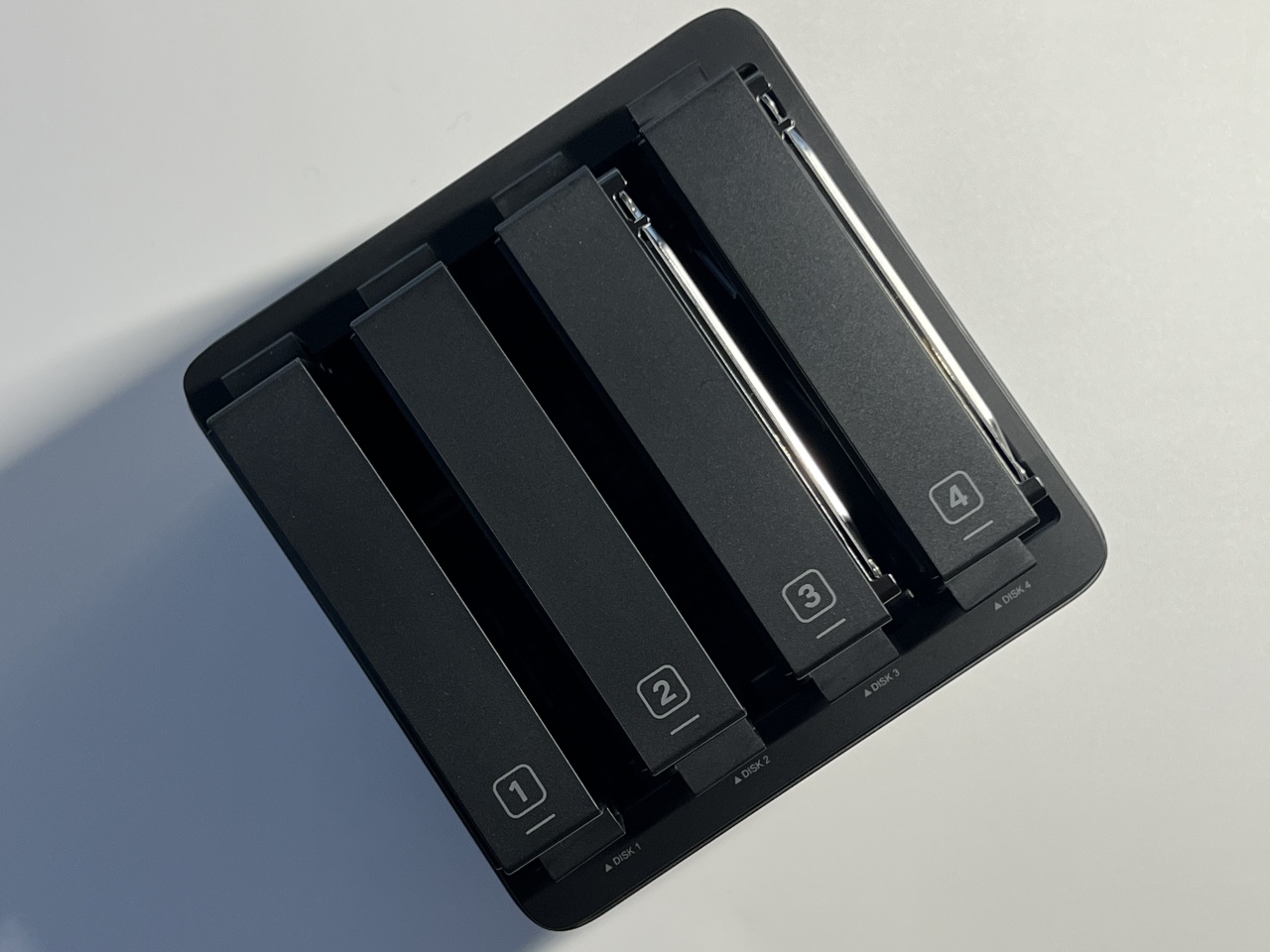 整个NAS有四个盘位,支持2.5寸固态和3.5寸机械,最大可拓展120TB(注意要买垂直盘,不能买叠瓦盘)。