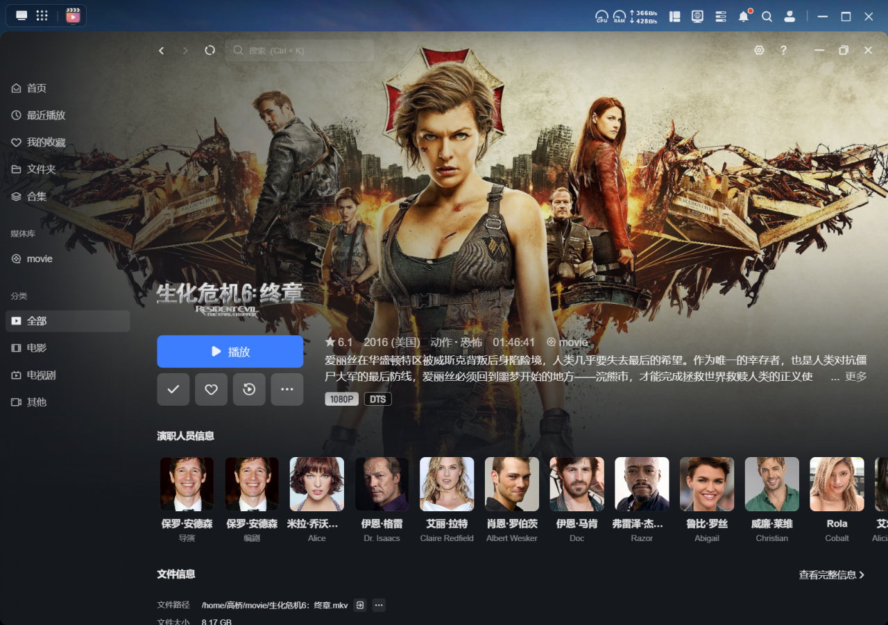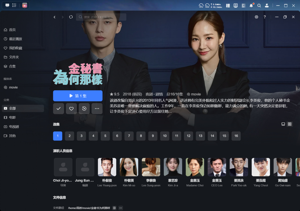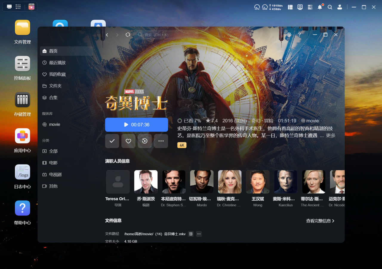 视频上传好之后直接进入NAS内置的影视中心,影视中心通过TMDB以及智能识别双刮削源自动扫描磁盘里的影视资源,同时在影视库里会自动匹配影视资源相应的宣传海报封面和简介等,帮忙生成海报墙,电视剧能看到单集的标题和封面,点开影片还能看到影片详细信息以及参演成员信息和评分,影视资源名字不对可以自己手动修改匹配信息,非常方便!