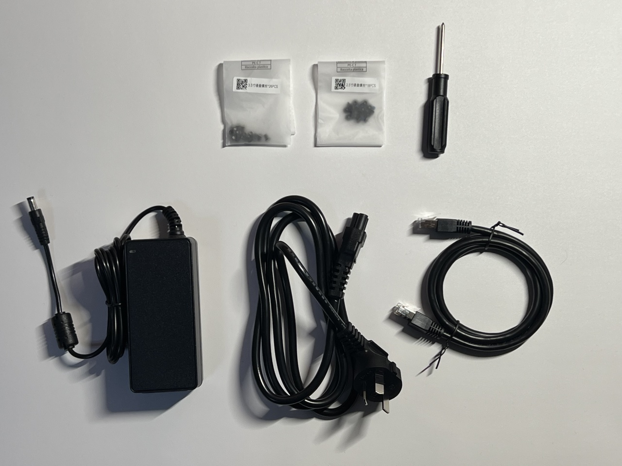 配件给到了一根72W的DC充电线、2.5寸/3.5寸硬盘螺丝、螺丝刀、网线,配件都很实在。