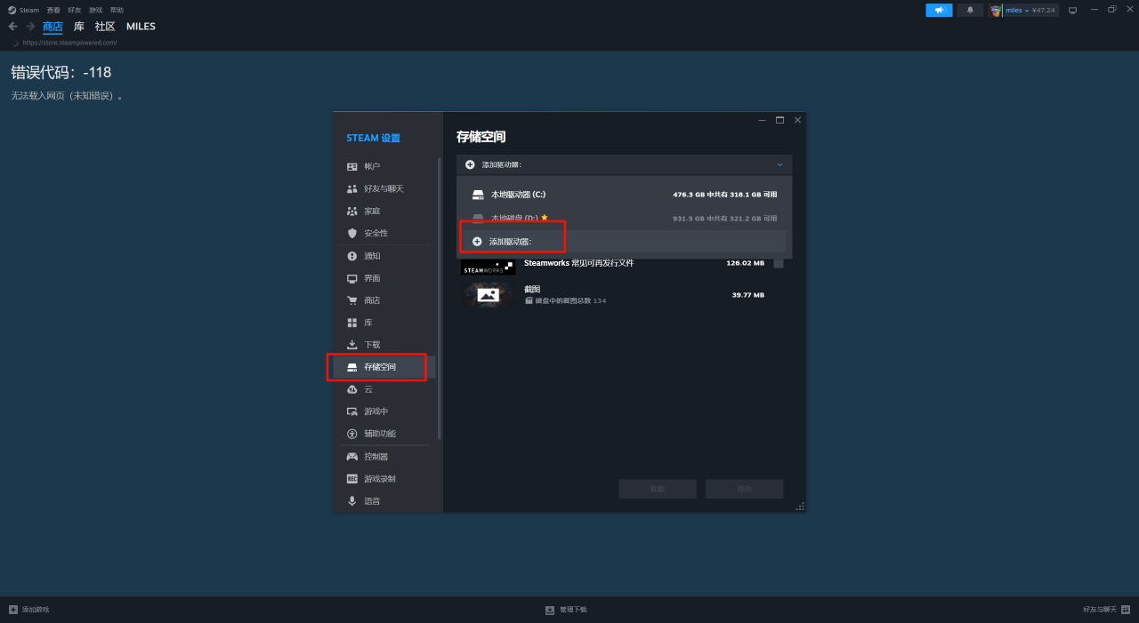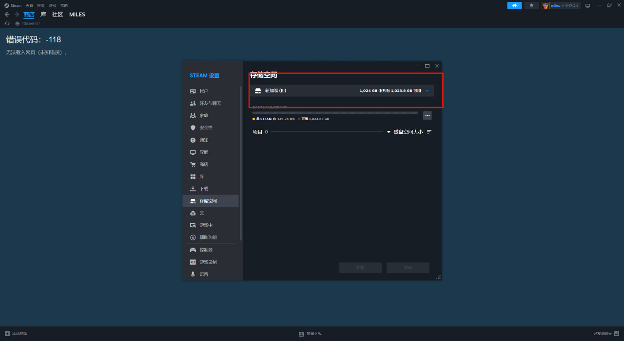 点击存储空间,点击添加驱动器,下拉选择新建的NAS磁盘即可设置成功,下载具体游戏时可以在页面选择新建的盘