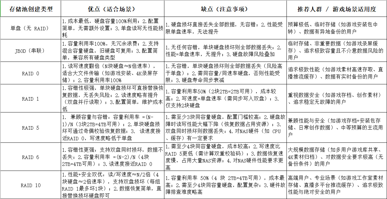 简单整理了下NAS存储池常见的创建类型的优缺点,大家有需要可以收藏保存。
