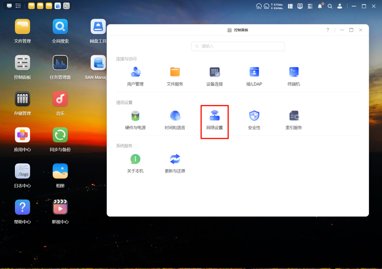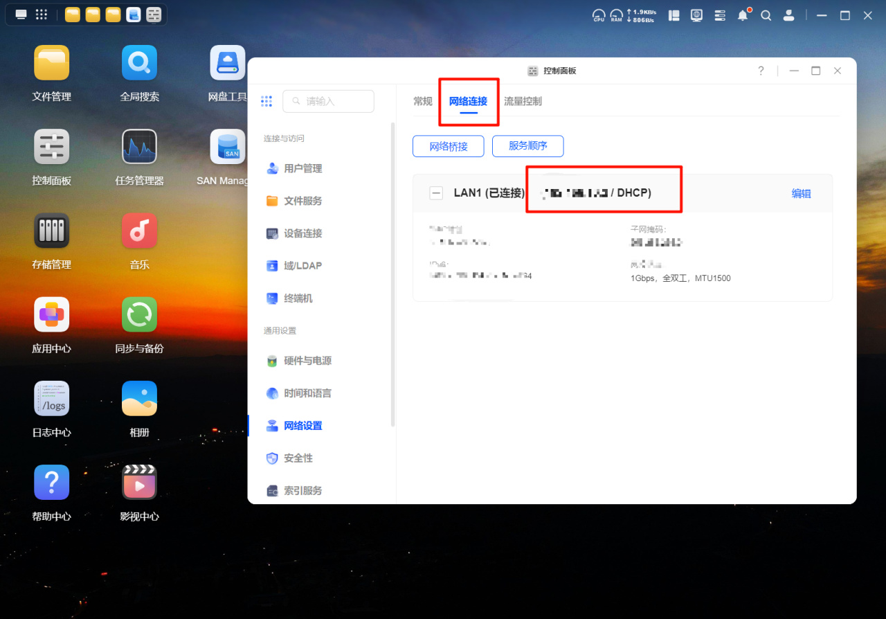 这是需要进NAS里查找NAS的IP地址。点击左侧控制面板,选择网络设置