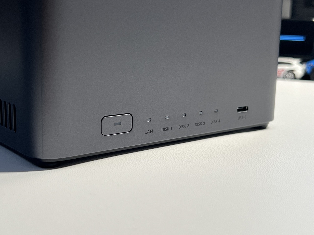 从左到右依次是开机键、网络指示灯、4个盘位状态指示灯、5G速率Type-C口(平常可以拿来拷贝移动硬盘里的文件)。