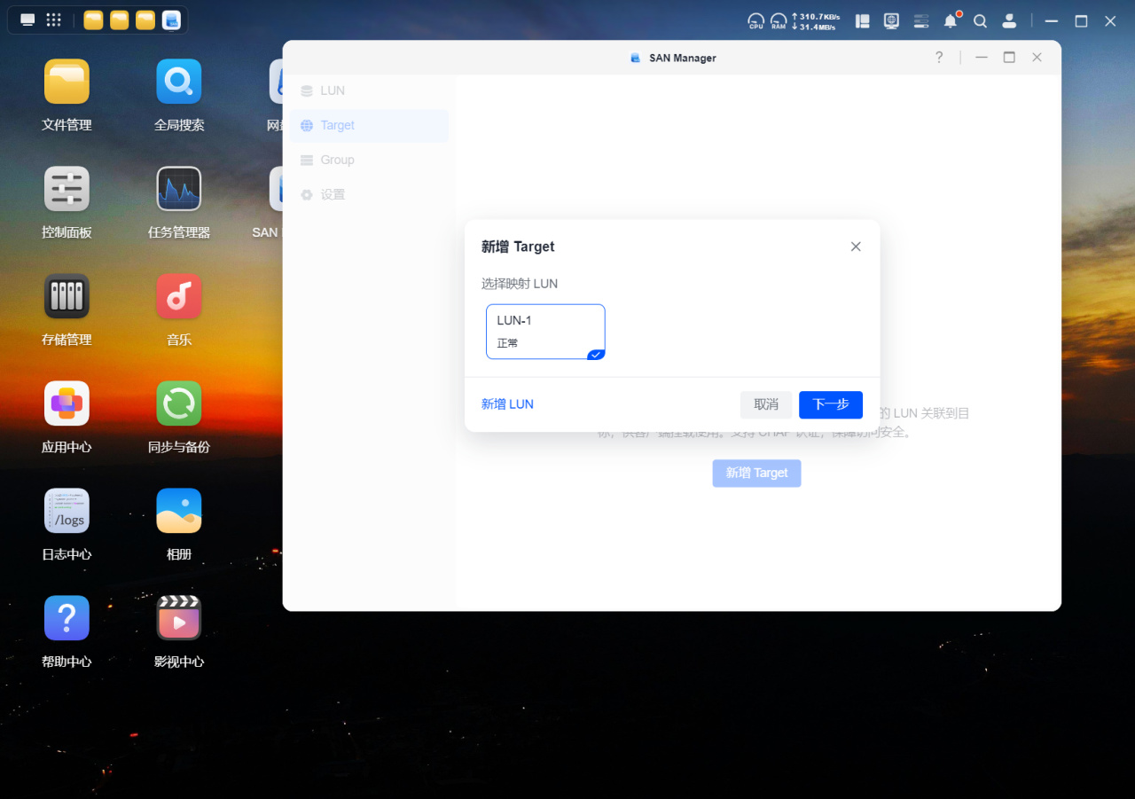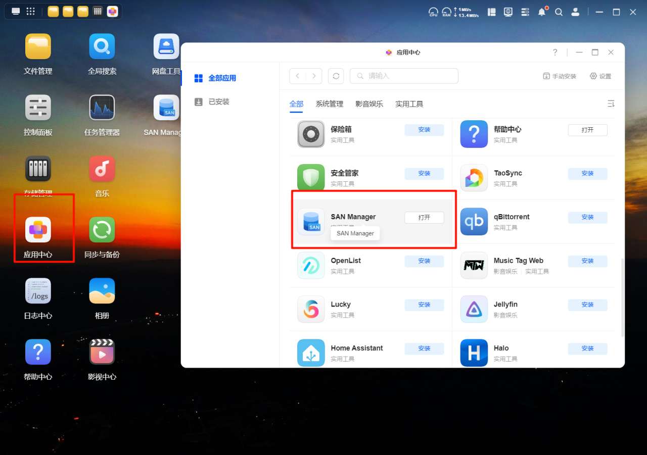 首先在桌面应用中心里下载SAN Manager(iscsi协议的管理工具)。