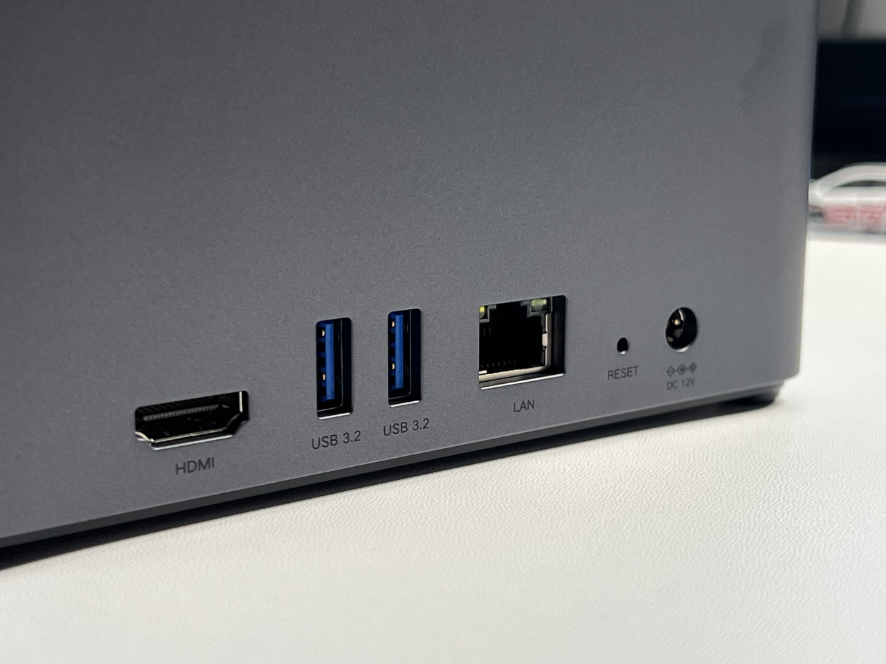 背面从左到右依次是HDMI2.1接口、USB3.2接口×2(插A口的外置存储或者网卡)、2.5G千兆网口、重置孔、DC充电口。